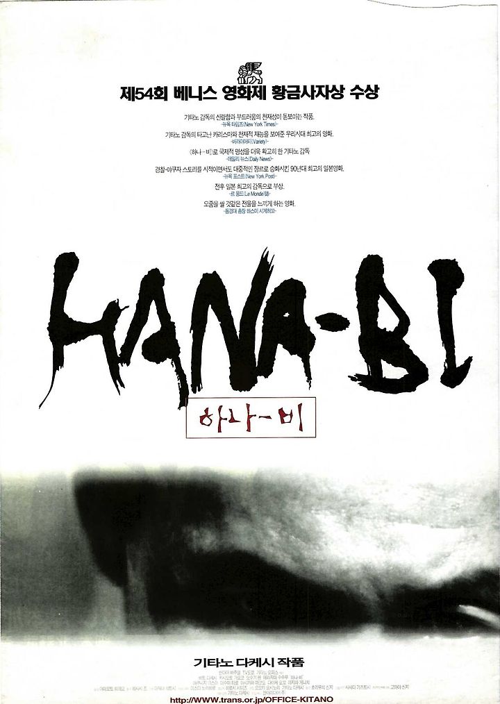 기타노 다케시의 영화인으로서의 전성기는 1990년대일 것이다. 그중에서도 그의 영화적 특징이 모두, 그리고 조화롭게 섞여 들어가 있는 영화는 <하나-비>가 아닐까. 상이 작품을 선별하는 전부는 아니겠지만 최소한 괜찮은 기준을 세워줄 수 있는 바, 이 작품은 자그마치 베니스영화제 그랑프리를 수상했다. 여담으로, 우리나라에 정식으로 들어온 최초의 일본영화이기도 하다.