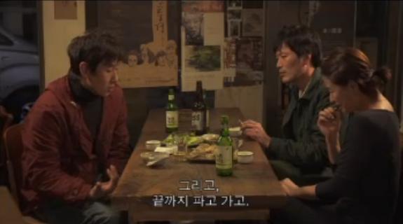 그런데 더욱 소름끼치게 만드는 건, 이 주제가 영화의 모든 술자리에서 돌고 돈다는 것이다. 이 대화는 애초에 선희와 문수의 대화에서 선희의 주장이었는데, 문수가 이를 재학에게 말하고, 재학이 다시 최교수에게 말하고, 최교수가 다시 선희에게 말하는 식이다. 제3자가 보기엔 웃기기 짝이 없지만 정작 당사자들은 진지하기 짝이 없는 얘기로, 이것이야말로 우리 주위에서 흔히 볼 수 있는 광경이다.