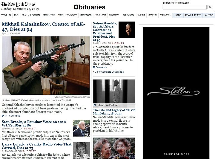 2013년 12월 24일 '뉴욕타임스' 부음란(오비츄어리 Obituaries) ⓒ뉴욕타임스